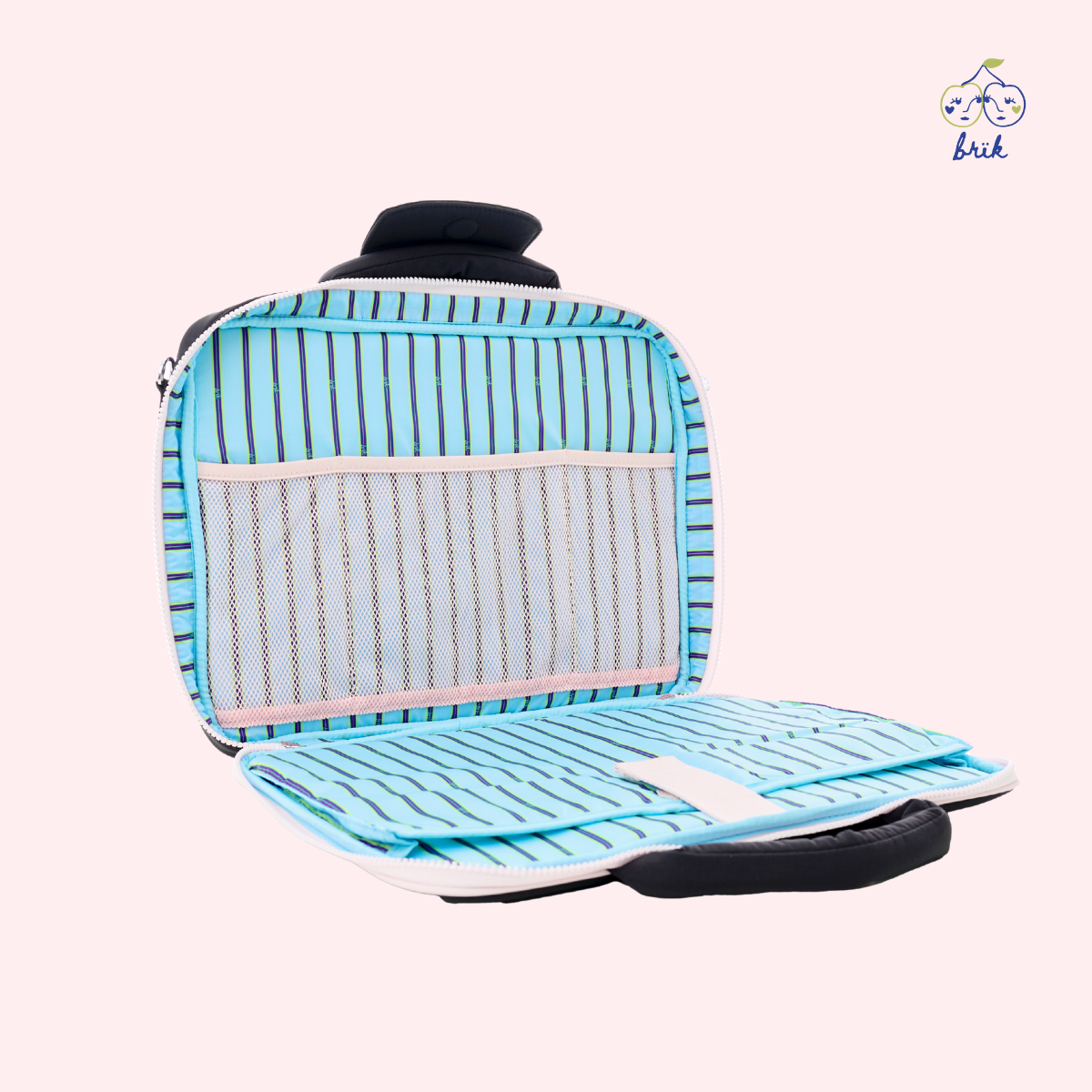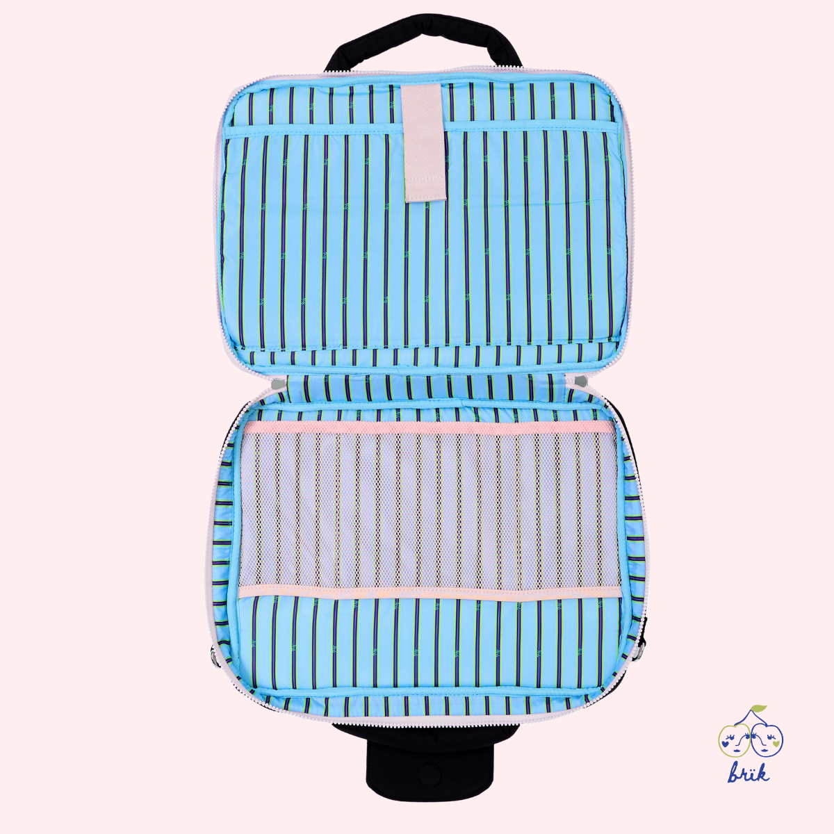 Peek inside to see our playful brïk stripes, a big cozy compartment for your laptop, and a mesh pocket divided into three little sections for your chargers, cables, and all the tiny bits.