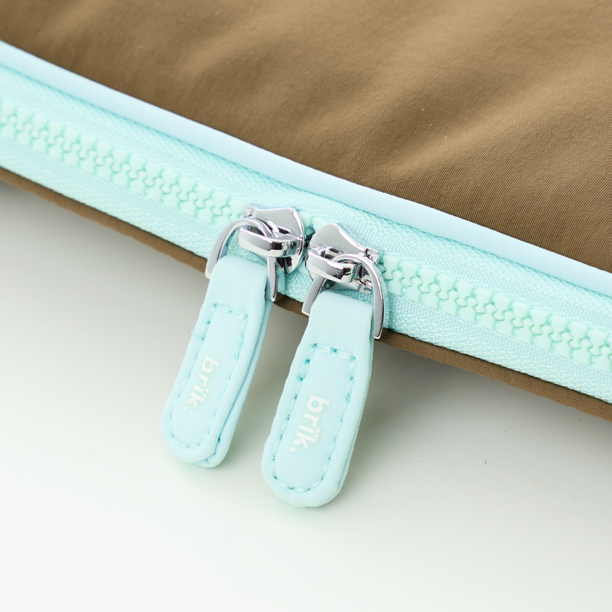 Peek inside to see our playful brïk stripes, a big cozy compartment for your laptop, and a mesh pocket divided into three little sections for your chargers, cables, and all the tiny bits.
