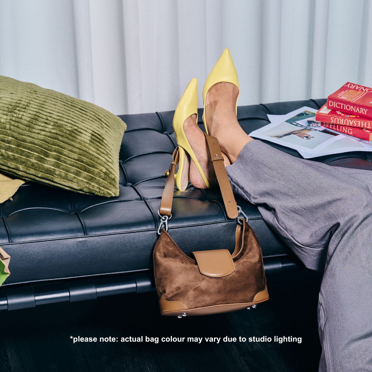 Crafted from the dreamiest velvet suede, the Slouchie you love returns in a petite, compact silhouette designed to hold just your essentials. Perfect for days when you want to travel light—just your phone, cards, and only the little things you need.